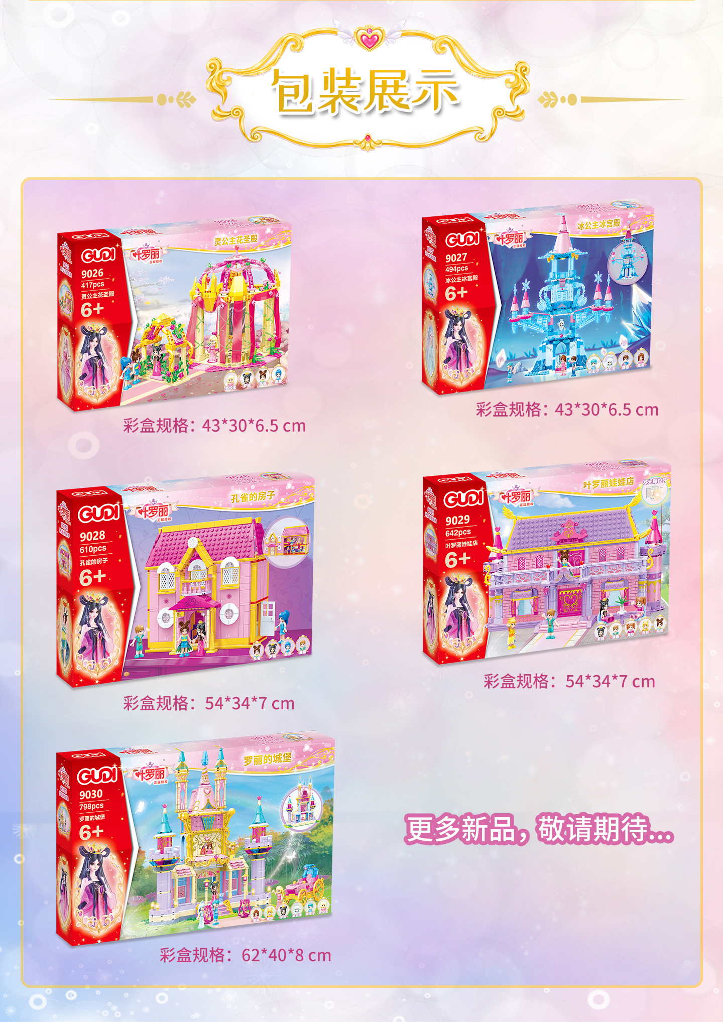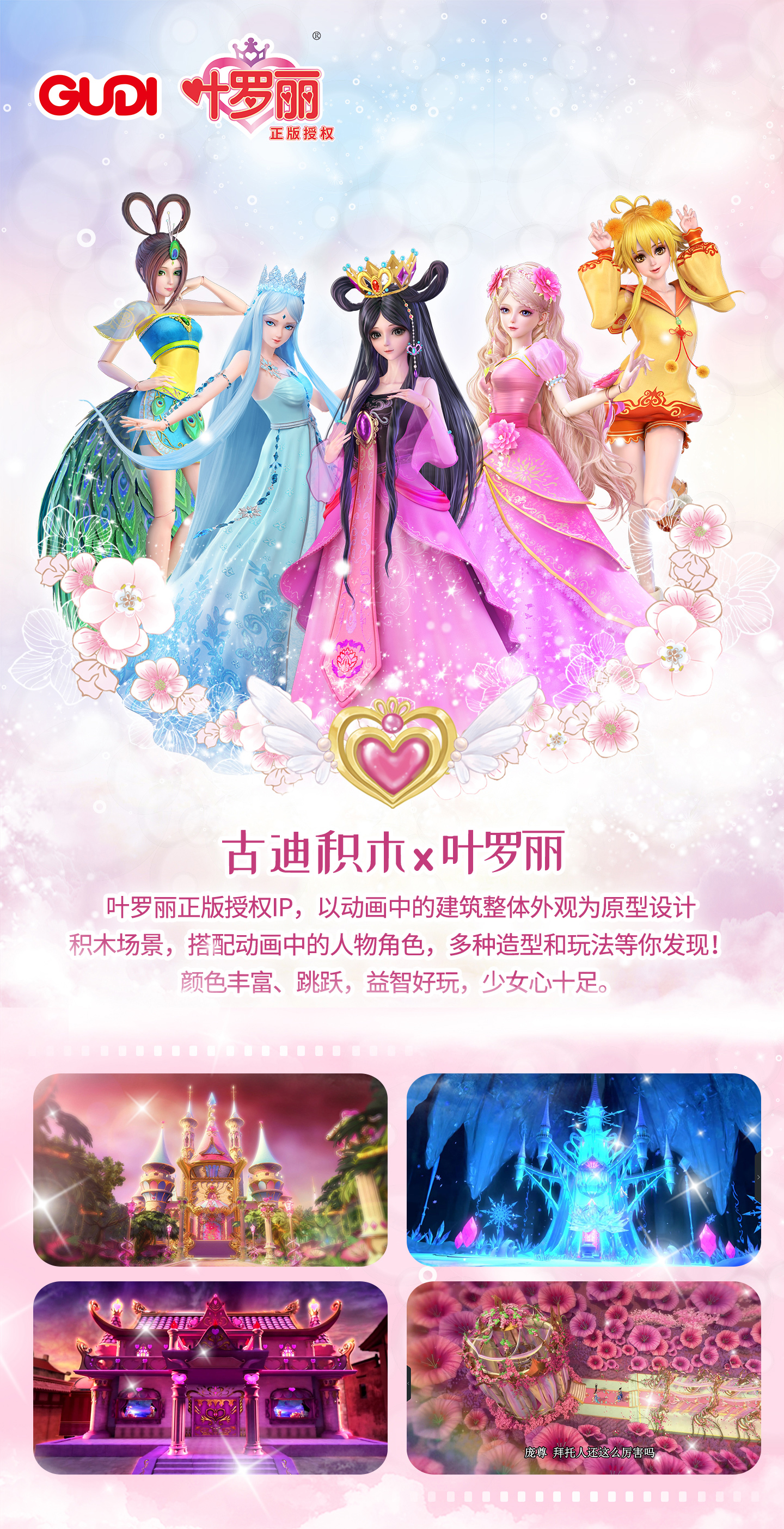 古迪積木葉羅麗系列,第一彈共推出了5個(gè)系列,分別是人氣角色辛靈的葉羅麗娃娃店,羅麗與她的城堡,孔雀的房子,還有冰冷高貴的冰公主與她的宮殿,和靈公主的花圣殿,為進(jìn)一步滿足消費(fèi)者需求、拉近消費(fèi)者與品牌距離,古迪積木將原作中的羅麗、辛靈、冰公主、孔雀等人物形象融入產(chǎn)品設(shè)計(jì),附能仙宮魔堡,讓積木場(chǎng)景更具有內(nèi)涵與故事情節(jié),引領(lǐng)、個(gè)性化、多元化的積木品牌新風(fēng)潮。