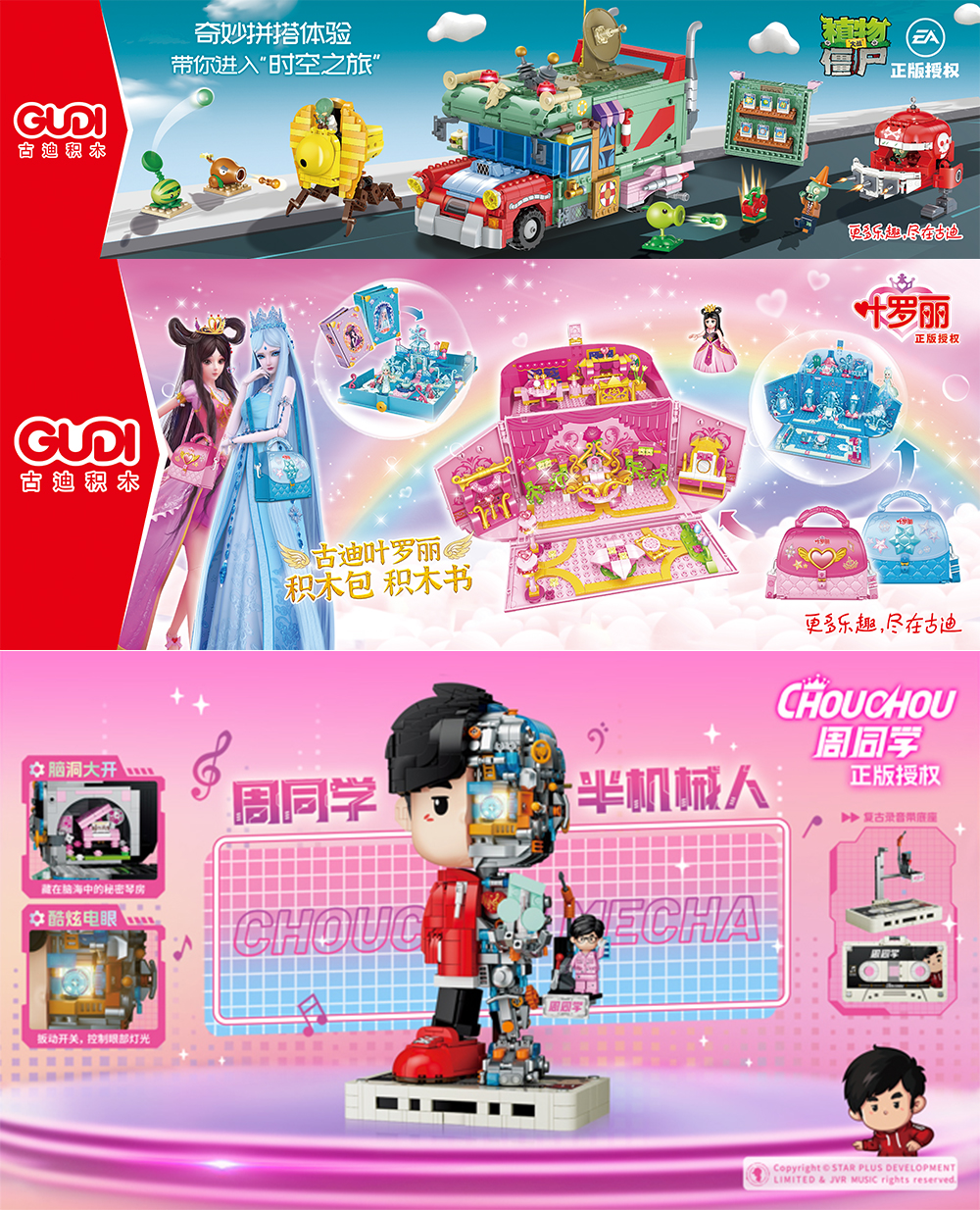 古迪積木是新樂新科教文化旗下積木品牌。作為中國積木原創(chuàng)品牌,古迪積木在十余年來一直以來致力于研發(fā)、設計、生產、銷售高品質的積木產品。而在近幾年來,古迪積木更是積極開啟跨界合作,攜手大牌IP,不斷為品牌賦能。截至目前已經與經典游戲IP——植物大戰(zhàn)僵尸;國內知名女孩動畫IP——精靈夢葉羅麗;周杰倫正版二次元形象——周同學等多個知名IP聯名打造多款積木玩具,持續(xù)為玩具市場和消費者帶來創(chuàng)意十足的積木產品,解鎖IP多樣玩法,讓玩具可玩性與實用性價值并存,進一步鞏固了古迪積木在積木市場的領先地位。
