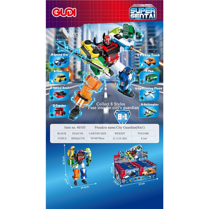 - Description:40103A-Sports car-72PCS; 40103B-Taxi-62PCS; 40103C-Speed boat-76PCS; 40103D-Tractor-73PCS; 40103E-Pickup truck-66PCS; 40103F-Van-83PCS; 4010G-Sightseeing plane-69PCS; 40103H-Helicopter-74PCS